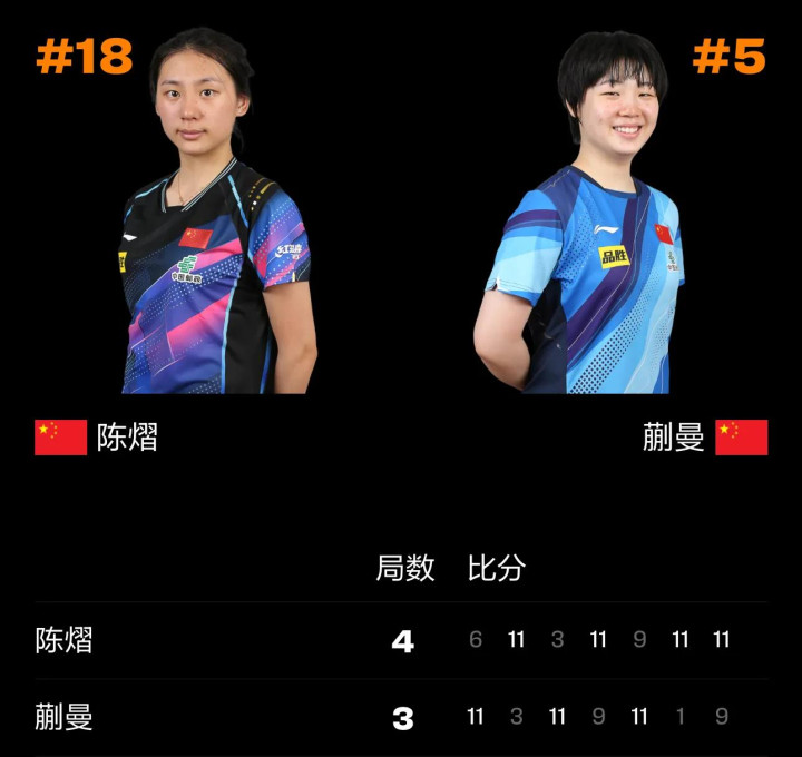 北京时间7月13日,WTT美国大满贯女单半决赛中,世界第5蒯曼对阵世界第18陈熠,蒯曼在手握两个赛点局时并没有把握住,被陈熠完强拖入决胜局再度实现逆转。最终,陈熠4-3力克蒯曼,晋级女单决赛,将与下半区朱雨玲争夺冠军。